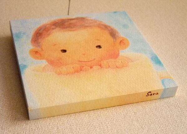 表情のある紙にプリントした絵を木製の板に張り付けて作りました。